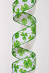 1.5" x 10Yds Wired Satin Watercolor Shamrocks Ribbon Green/White